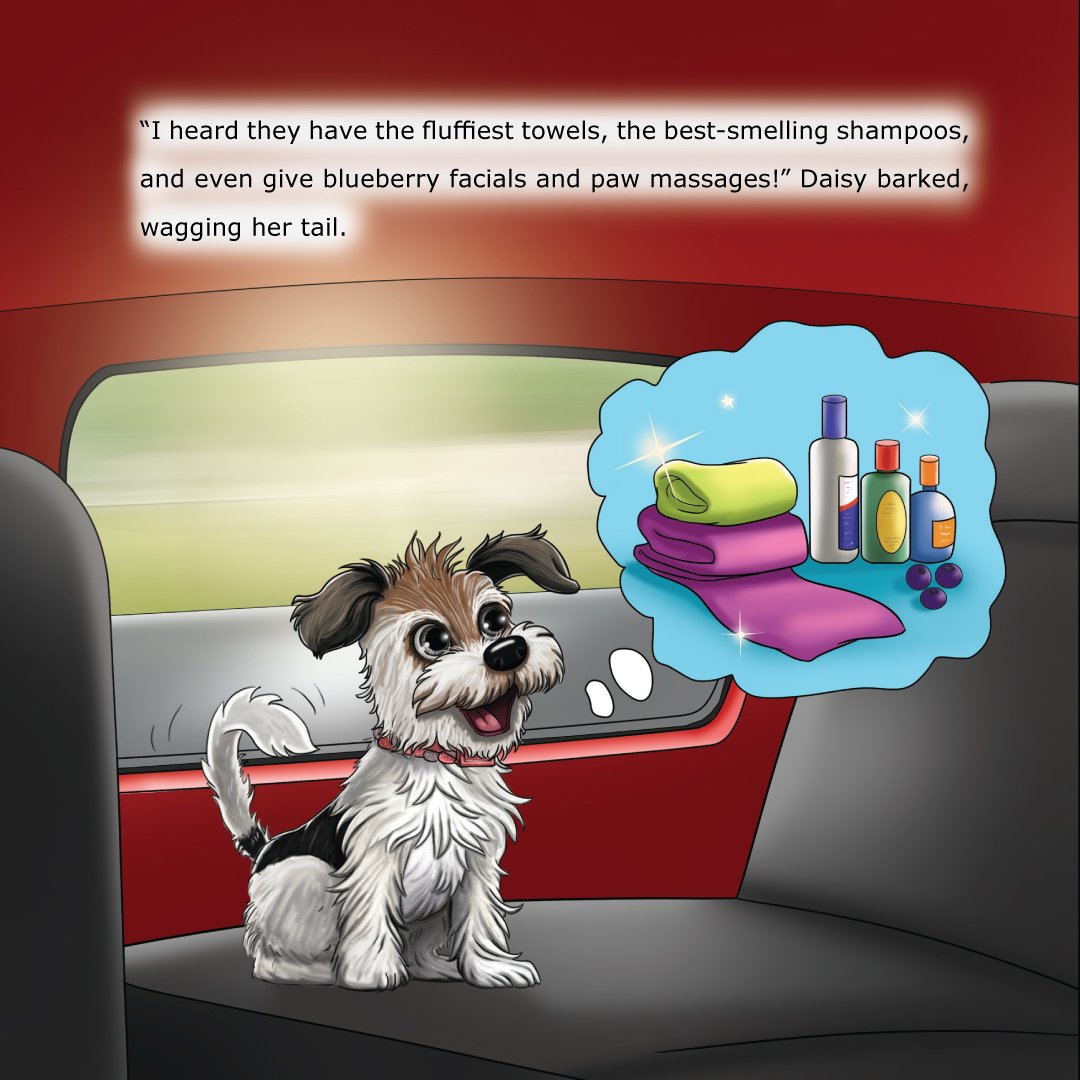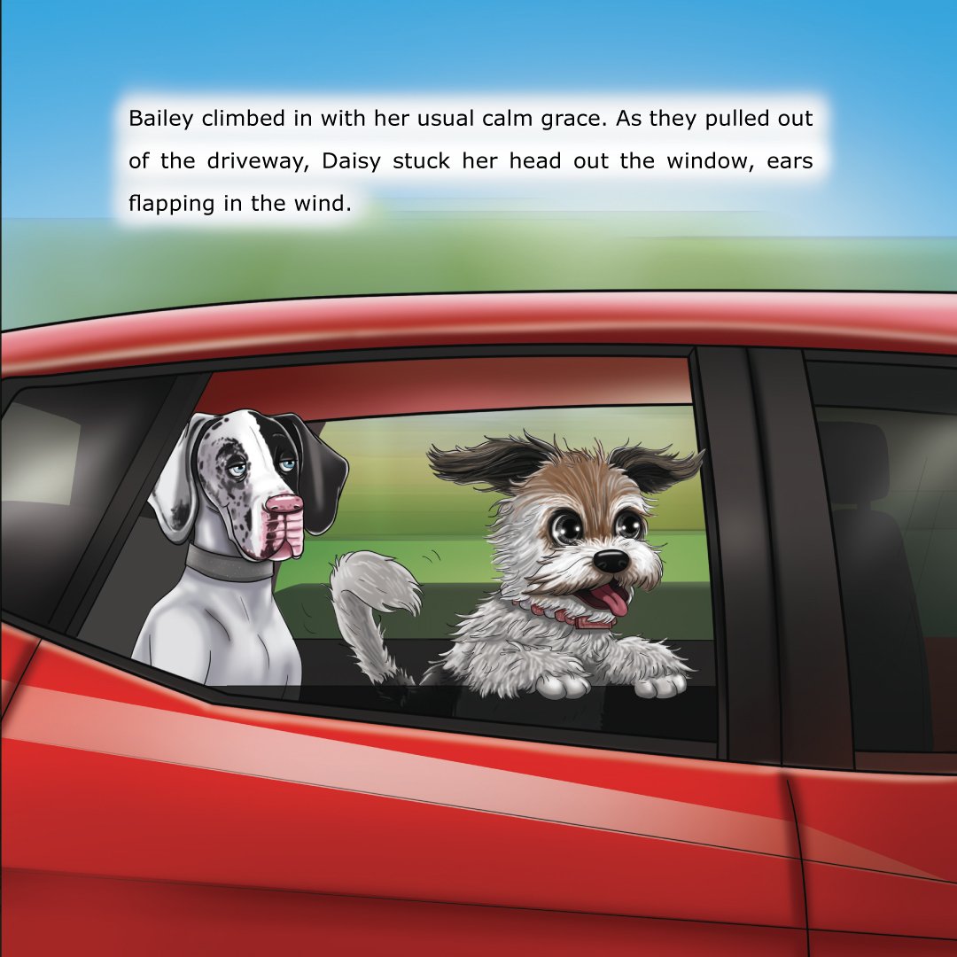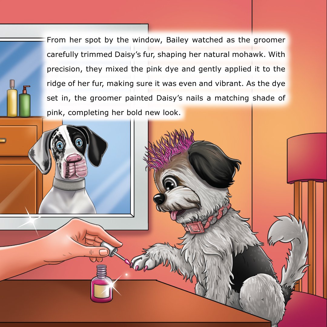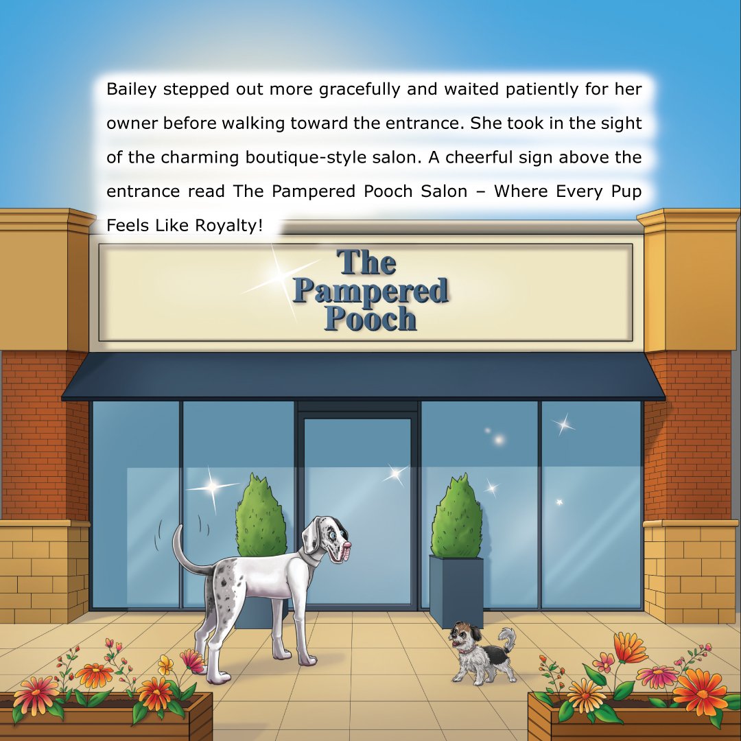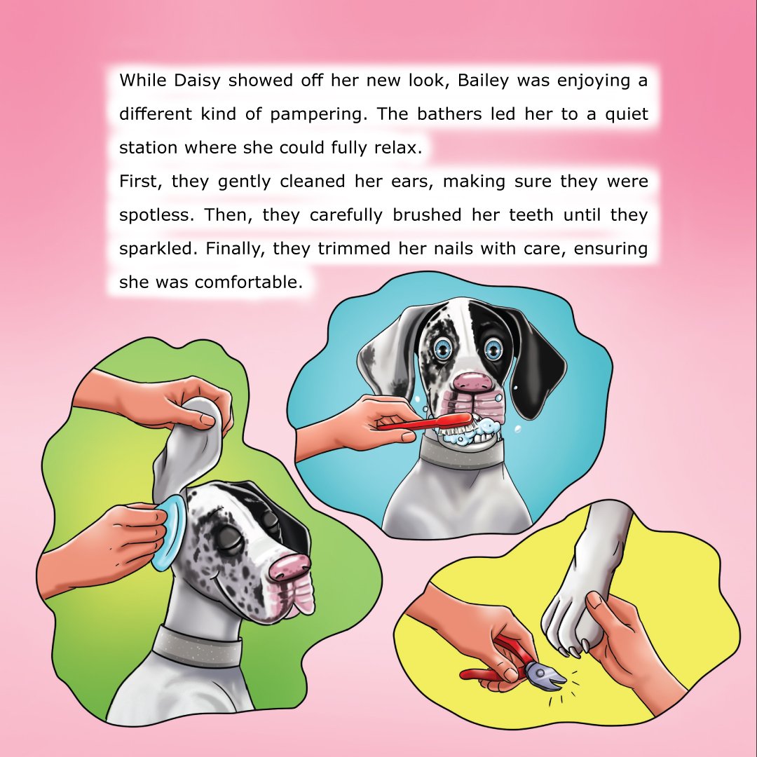 In Book 2, sister duo Bailey (calm Great Dane) and Daisy (curious terrier mix) go to The Pampered Pooch salon. Bailey anticipates a peaceful spa day, but Daisy’s energy leads to hilarious, silly moments and a surprise makeover. The story celebrates self-care, individuality, and sisterhood, with a closing message from both sisters encouraging kids to embrace who they are.