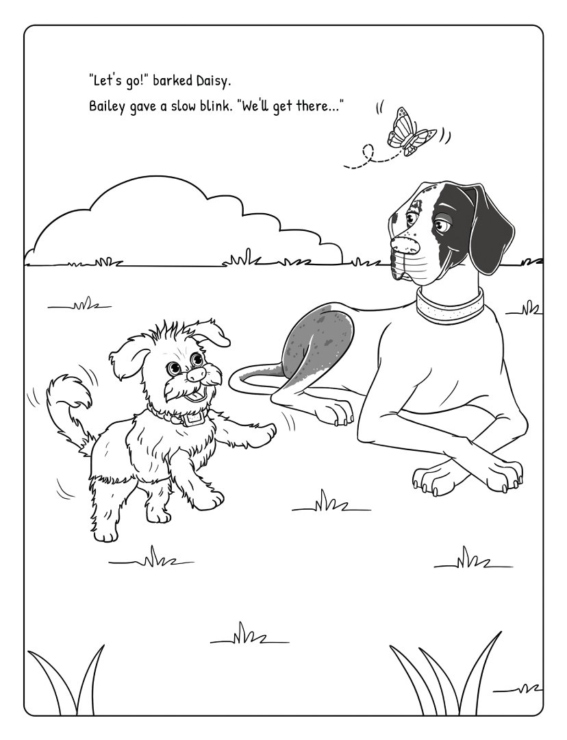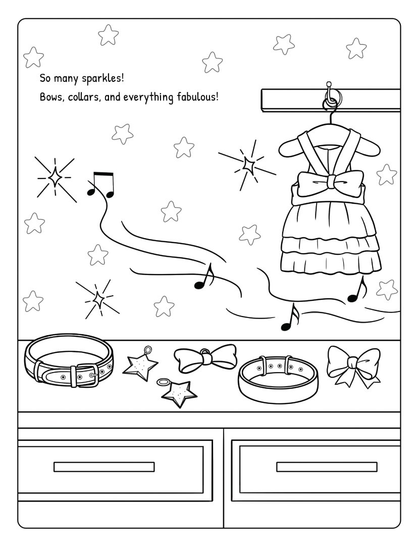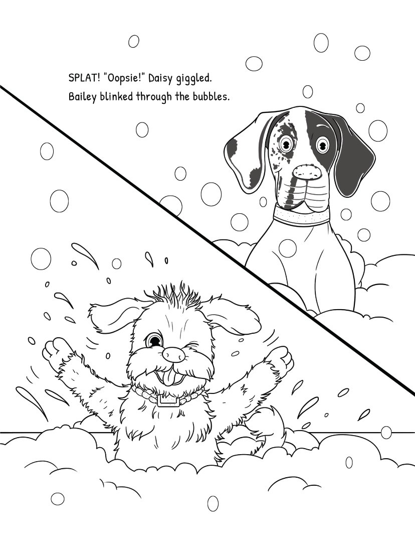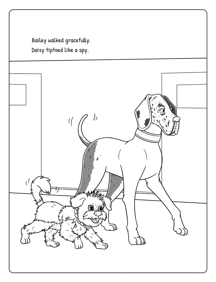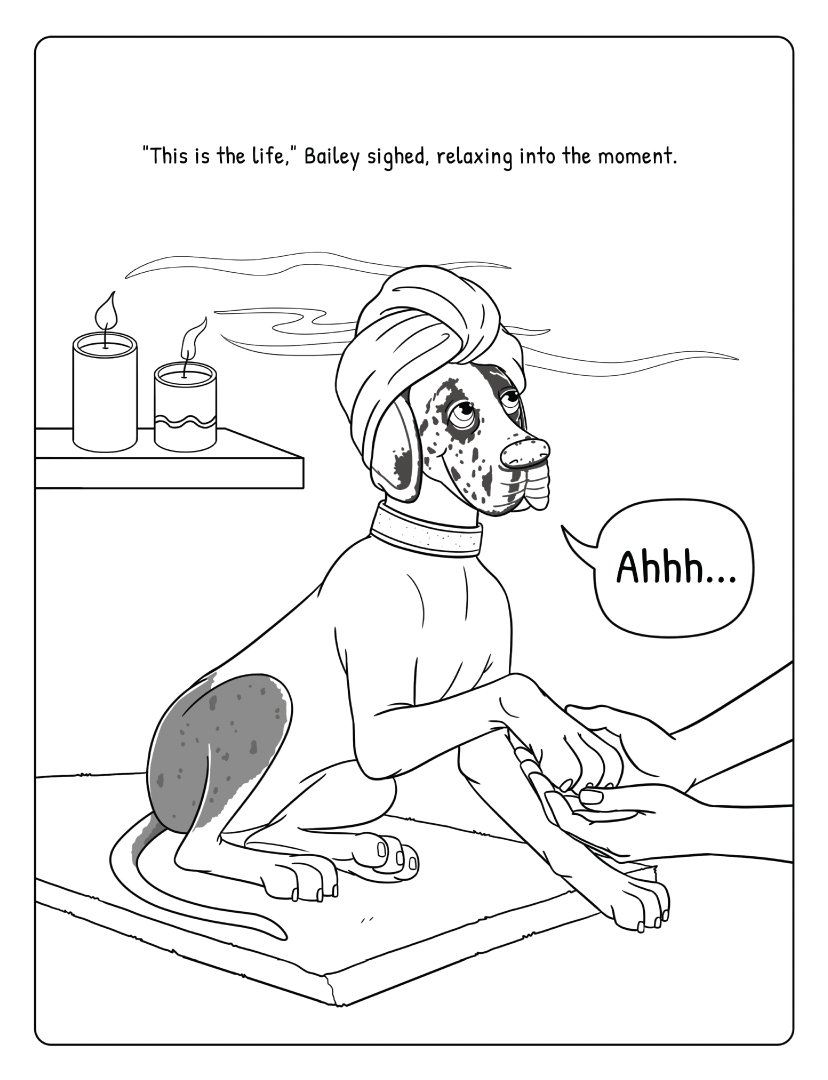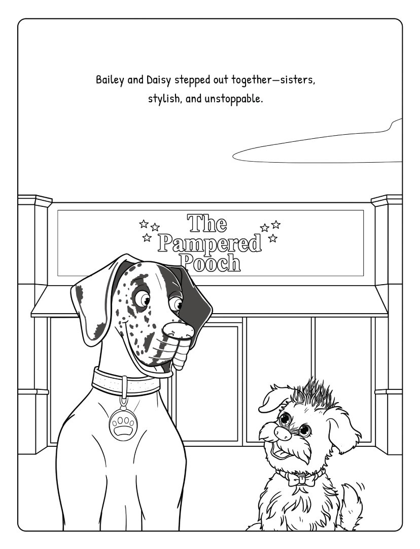 A companion coloring book with over 40 one-sided scenes directly from the story. Bold, simple outlines make it easy for the youngest readers (ages 4–6) to color along as Bailey, a Great Dane, and Daisy, her playful terrier mix sister, enjoy a fun and lighthearted spa day at their favorite dog salon.